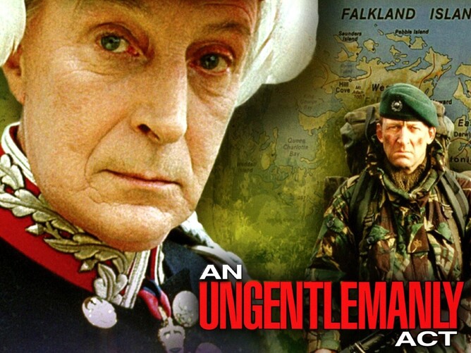 AN UNGENTLEMANLY ACT transpires during the first few hours and days of the Falkland Islands War. Ian Richardson portrays the political head of the Falklands, who, surprised by the invasion by Argentineans, focuses on getting his wife to a secure location just as much as he does on protecting his citizens. Major Mike Norman (Bob Peck) leads an elite group of soldiers in combat against the enemy. Meanwhile, the citizens of the islands discover how their previously placid lives have been altered by the beginning of the war.