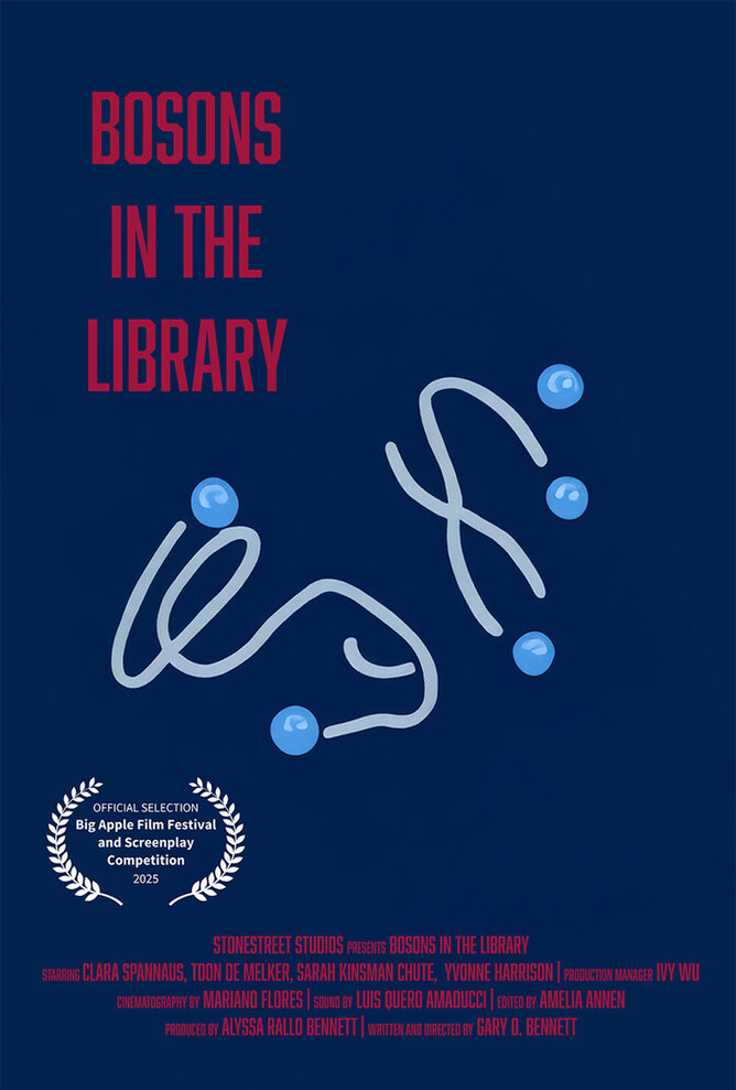 Set during exam season in a college library, 'BOSONS IN THE LIBRARY' follows one student's spiralling focus as he's bombarded by distractions — both mundane and existential. Written and directed by Gary O. Bennett, the film stars Clara Spannaus, Toon de Melker, Sarah Kinsman Chute, and Yvonne Harrison.